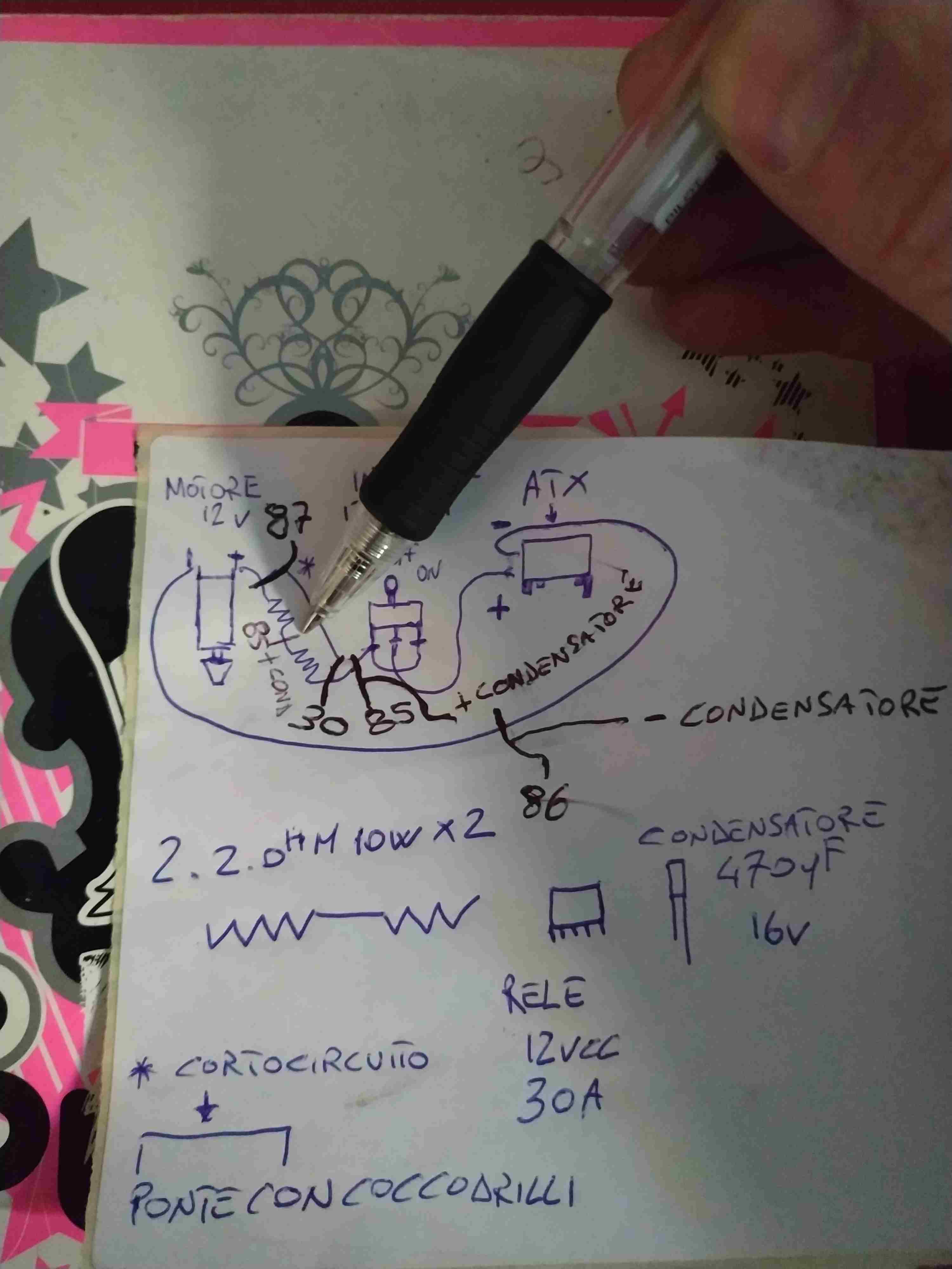 peppe277 Inserita: 8 febbraio 2025 Autore Segnala Inserita: 8 febbraio 2025 1 ora fa, Livio Orsini ha scritto: Allora colleghi i contatti come fosse il ponticello del corto circuito: il contatto 87 lo colleghi sul filo che va al motore, il contatto 30 lo colleghi al filo che viene dall'interruttore. Il terminale 85 della bobina lo colleghi anche lui al filo che viene dall'interruttore, a questo filo colleghi anche il "+" del condensatore. Il terminale 86 lo colleghi al "-" dell'alimentatore. Il "-" del condensatore lo colleghi al terminale 86 del relè. Quando chiudi l'interruttore il condensatore è praticamente un cortocircuito, quindi la tensione ai capi del relè è quasi zero ed il relè non chiude. Il condensatore si carica velocemente perchè la resistenza che ha in serie è piccolissima; quando la tensione raggiunge il valore suffciente allla bobina per far chiudere il contatto metti in certo i resistori di limitazione. Qunado apri l'interruttore il relè rimane eccitato ancora qualche istante, perchè il condensatore dovrà scaricarsi attraverso la bobina del relè. Io il valore del condensatore lo messo a naso e potrebbe risultare un po' piccolo, quindi il ritardo potrebbe essere insufficiente e l'alimentatore potrebbe andare in protezione. In questo caso bisogna aumentare il valore del condensatore, magari mettendone un'altro in parallelo. È una temporizzazione piuttosto rozza, ma dovrebbe funzionare. Intanto ti ringrazio Livio per tutto quello che hai fatto per me e per la pazienza che hai avuto. Ho seguito alla lettera i collegamenti da te postati spero non aver sbagliato nulla. In questo modo va bene? Ps: il fatto che io uso i poli invertiti per cambiare il senso rotativo implica qualcosa?