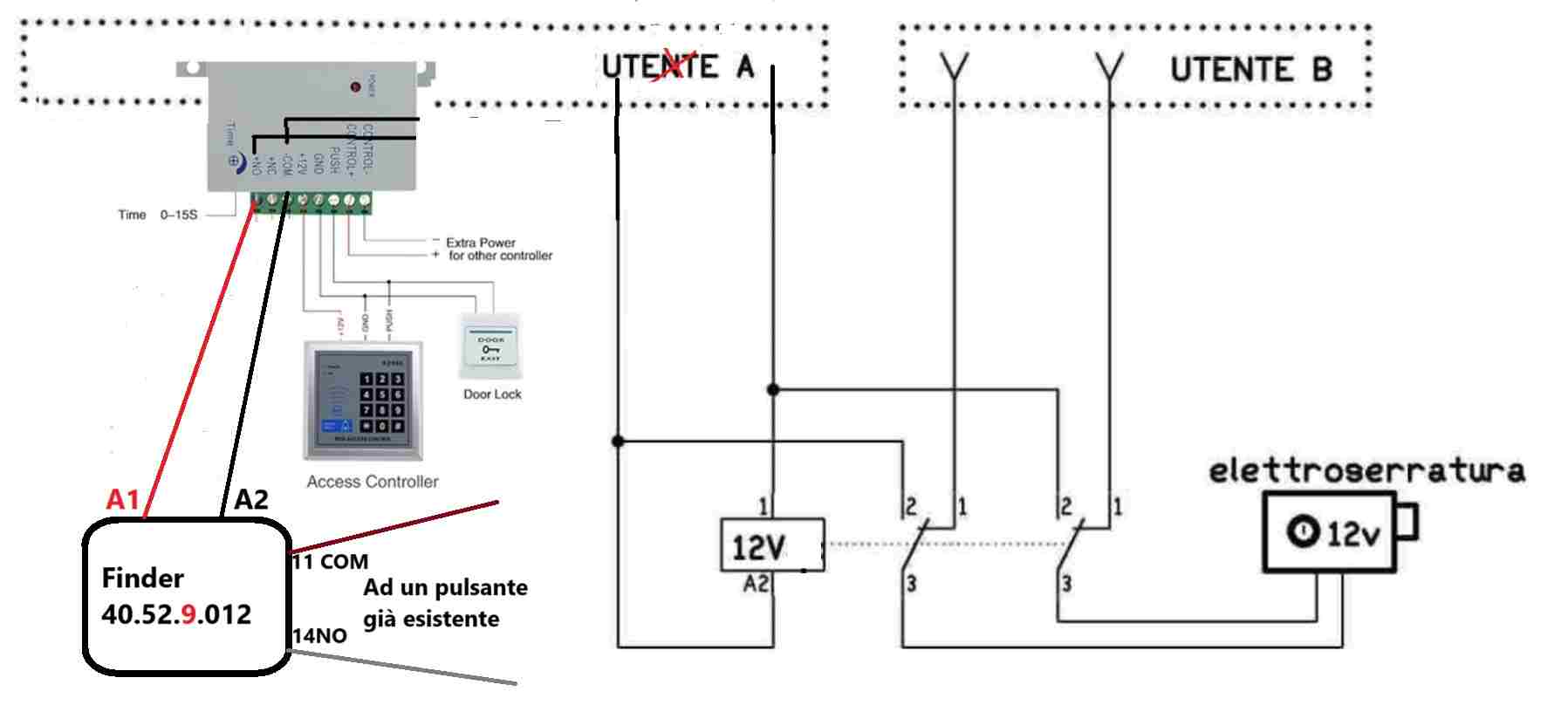 kronos72it Inserita: 4 marzo 2025 Autore Segnala Inserita: 4 marzo 2025 (modificato) 20 ore fa, ROBY 73 ha scritto: Allora, a te non interessa assolutamente nulla che la serratura funzioni con tensione continua o alternata, (anche se quelle a scatto funzionano meglio in alternata). questo è fondamentale nel decidere quale delle due soluzioni , basta che in cc non si bruci ! Partiamo dal fatto che (se non ho capito male), attualmente con il collegamento che hai usato e suggerito nell'altra discussione, il cancello si apre ugualmente sia dall'utenza A e sia dall'utenza B, giusto? Oppure non ho capito nulla io? In pratica il relè doppio contatto serve proprio a questo : a riposo connette il citofono e quando sollecitato dal pulsante connette il PS che alimenta lo stesso pulsante Anche no. Quindi, ora tu vuoi aggiungere il nuovo apparecchio a tastiera / lettore, che è un dispositivo indipendente e alla fin fine deve solo fornirti un contatto NA da aggiungere a quelli già esistenti per aprire la serratura; quindi, con lo schema che ti ho proposto, è come se tu aggiungessi un semplice pulsante in parallelo a quelli che già ci sono, che siano uno solo o cento pulsanti, il principio non cambia. Sì, o sì? 😄 Assolutamente si , la tua soluzione va bene , non ho dubbi , ho subbi sulla mia .La mia ha di negativo che piloto in cc la tua , se posso, che si porta dietro 2 PS e 2 relè : un sistema piu è complesso e piu è vulnerabile ! Modificato: 4 marzo 2025 da kronos72it