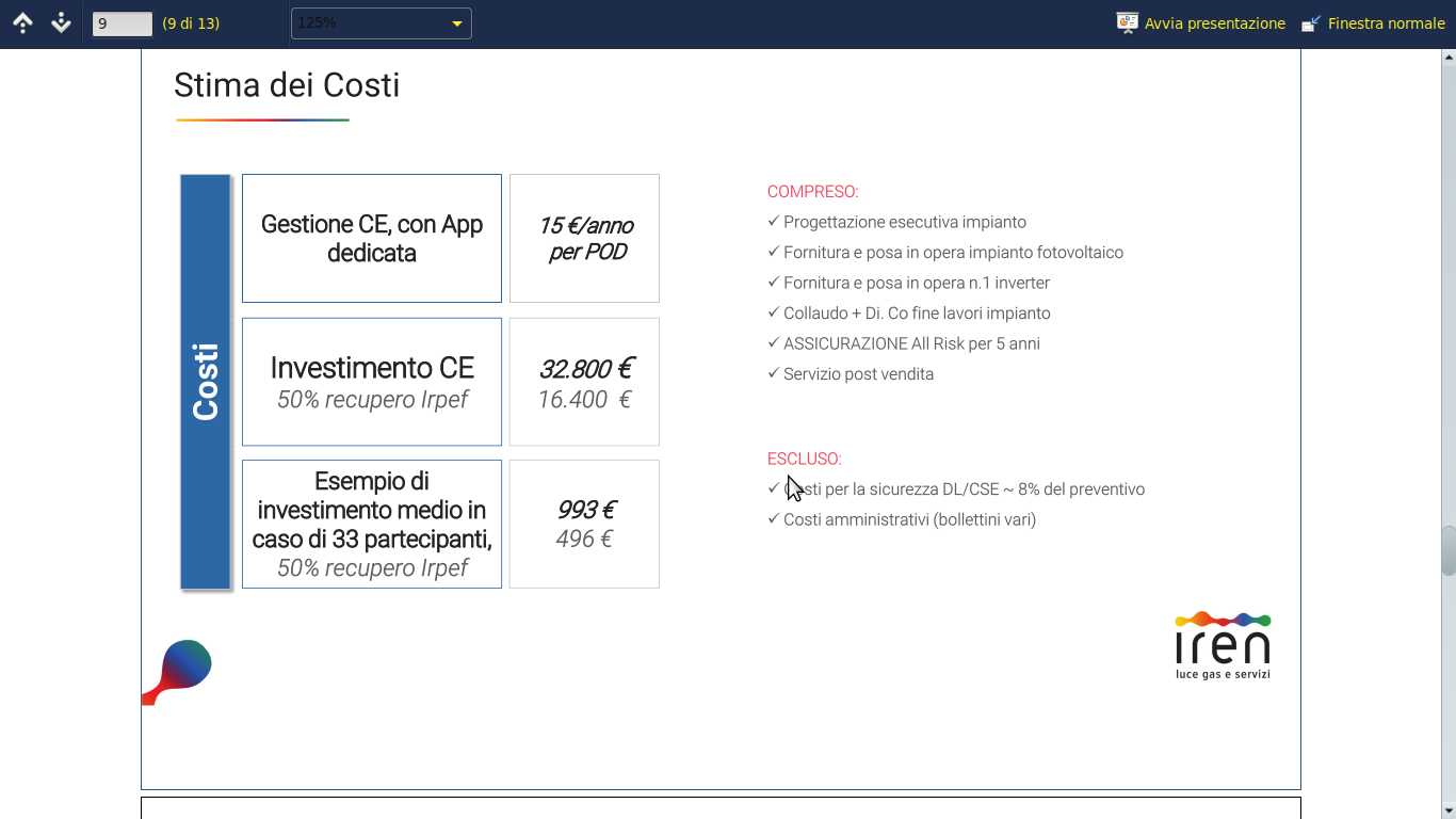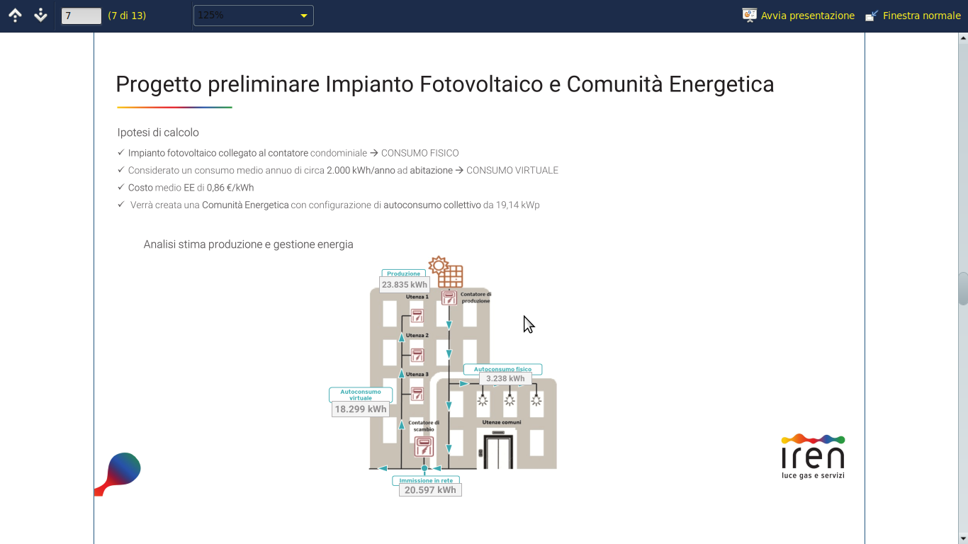 nik57 Inserito: 25 aprile 2025 Segnala Inserito: 25 aprile 2025 salve a tutti nel mio condominio si sta pensando di installare un impianto fv, cosa ne pensate dell'offerta allegata? mi sembra un tantino gonfiata soprattutto, (seconda immagine) il costo a kW (0.86€) risparmiato per autoconsumo e le altre due voci non sono troppo basse? considerato che la maggior parte dei condomini ha un consumo annuale intorno ai 2000 kW e come consumo condominiale abbiamo solo luce scale, cancello elettrico e teleriscaldamento centralizzato, ne vale la pena? siamo vincolati a cedere/vendere ad iren per 10/20 anni? conviene aspettare? grazie nik