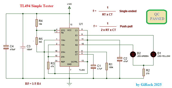 GiRock Inserita: 5 giugno 2025 Segnala Inserita: 5 giugno 2025 !!! OT !!! Piccolo schemino per testare il corretto funzionamento del TL494 (outboard)... Se è efficiente al 100% il suo comportamento sarà: LED1-ON ALL-OFF LED2-ON ALL-OFF etc... La cosa importante è che ci sia sempre un "Dead Time" tra l'accensione di un LED e l'altro...