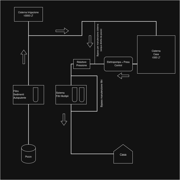 feazzu Inserito: 9 maggio 2025 Segnala Inserito: 9 maggio 2025 Buongiorno a tutti ho la necessità di rinnovare (rifare) l'attuale impianto idrico di casa. Vi allego un immagine con quello che è il mio progetto Non essendo ovviamente del mestiere, vorrei chiedere a voi alcune cose: 1. Il progetto che ho in mente può andare bene? 2. Ho pensato di mettere un primo filtro in modo da pulire l'acqua dai sedimenti anche per l'irrigazione. Qui però sorge la prima domanda. La pompa sommersa è da 1,5 hp per un pozzo da 50 MT. Quindi ha una pressione molto elevata (se non ricordo male siamo intorno agli 8 bar solo che ora si è rotto il manometro quindi non vi so dare un dato preciso). Secondo voi è necessario un riduttore di pressione prima del filtro? Esistono sennò filtri che gestiscono tali pressioni? 3. Ho pensato di usare per tutto il sistema tubi in polietilene PN16 da 32mm. Vanno Bene? Grazie a chi mi risponderà e aiuterà nella realizzazione!