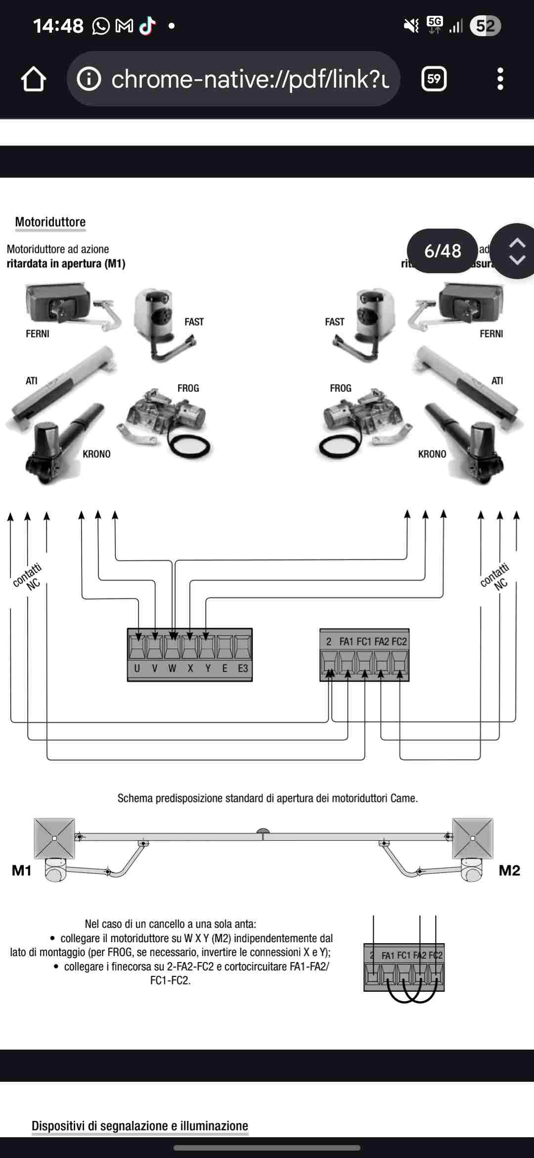 MatteoDv05 Inserita: 26 giugno Autore Segnala Inserita: 26 giugno Comunque Roby, uno dei collegamenti che penso di non star facendo correttamente è quello dei Finecorsa, ti inoltro come li ho collegati. Il "2" del finecorsa l'ho collegato al terminale libero della morsettiera del motore, mentre FA2, l'ho collegato al terminale "U" della morsettiera del motore. Mentre gli altri terminali del finecorsa li ho cablatu come nella prima immagine in basso, cortocircuitando FA1 con FA2 e FC1 con FC2. L'unica differenza è che dal FC2 non esce nessun cavo dato che l'ATI A5000 ha solo il finecorsa in apertura