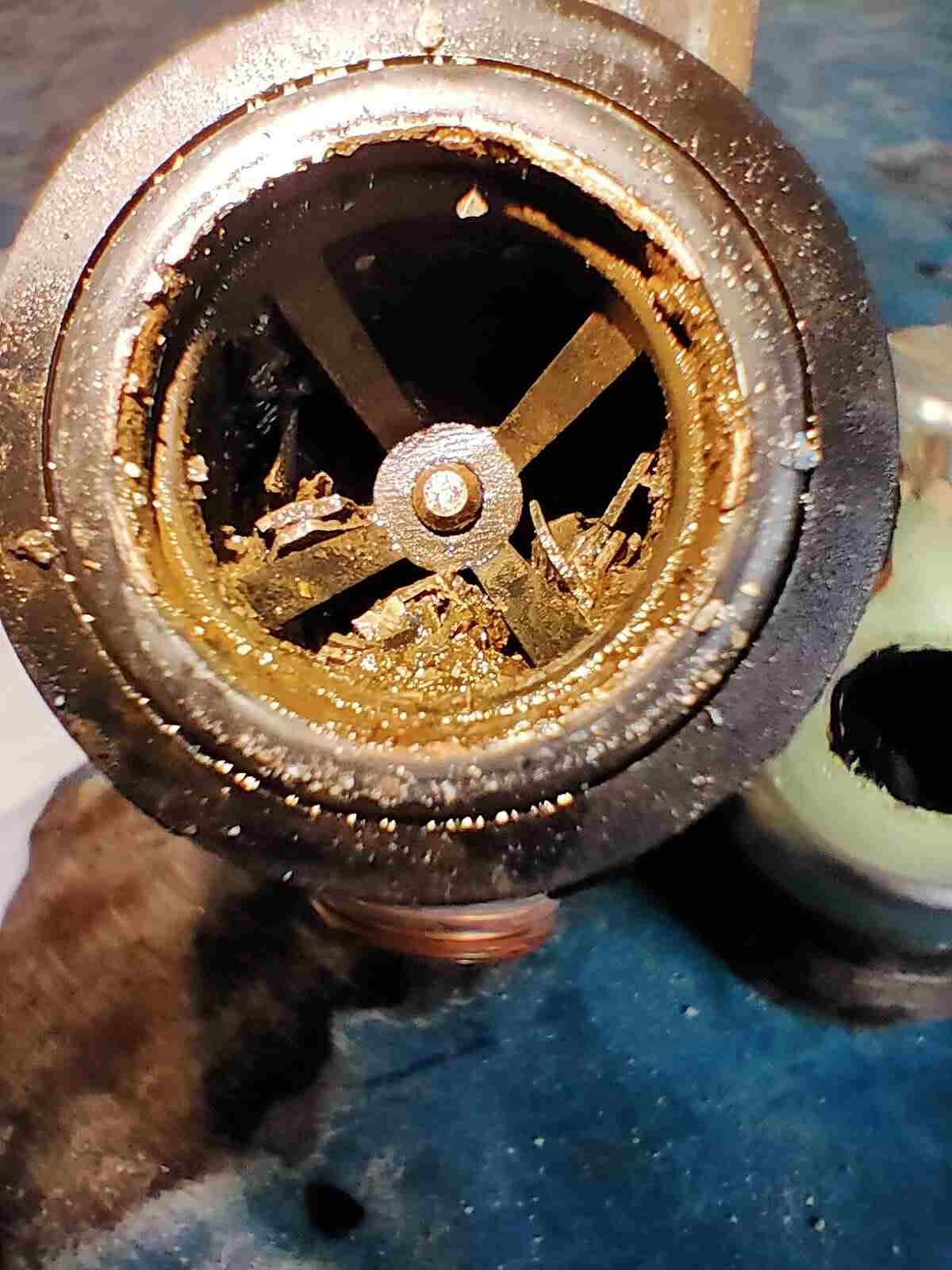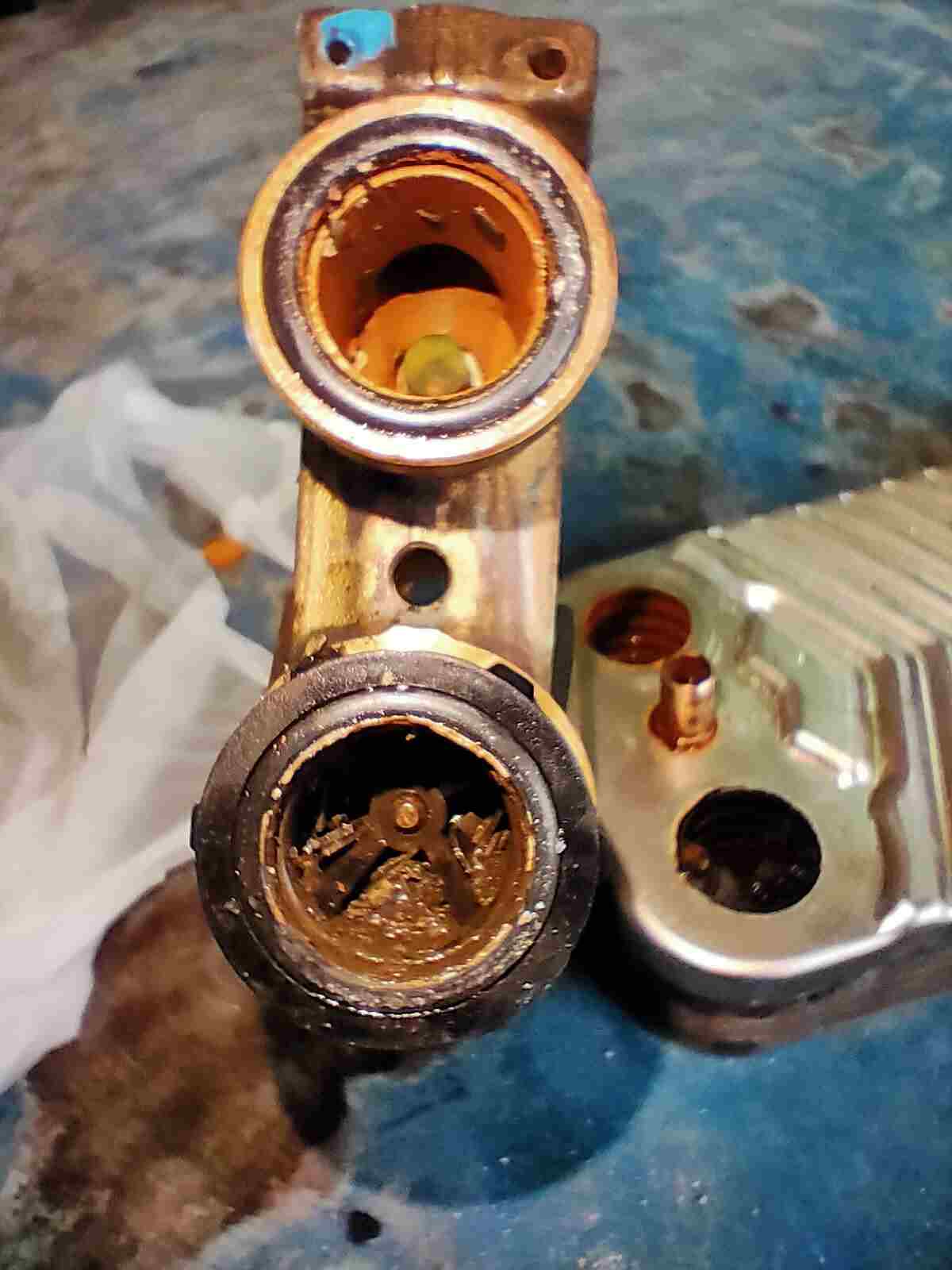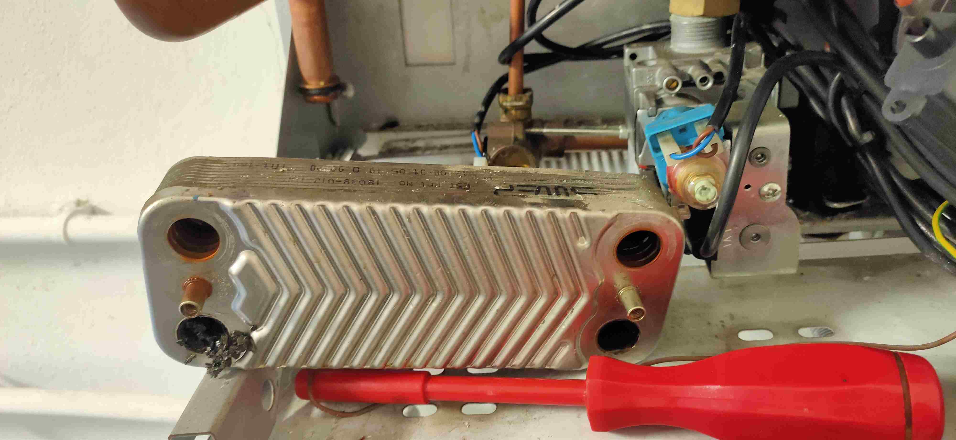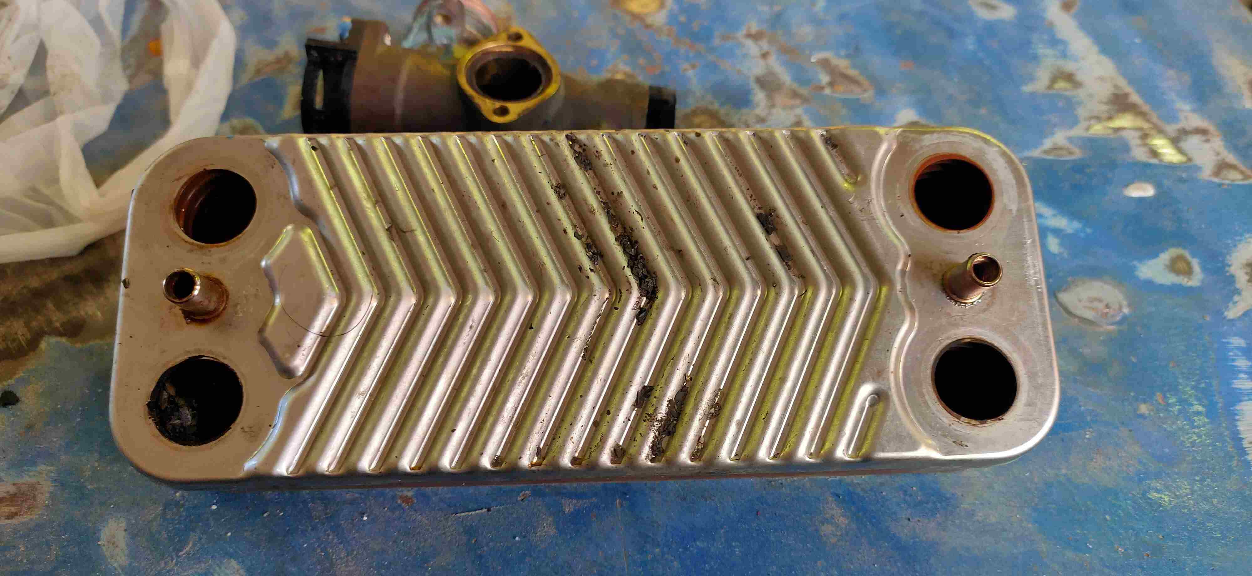 themonster Inserita: venerdì alle 12:26 Autore Segnala Inserita: venerdì alle 12:26 Buongiorno, chiedo scusa per l'enorme ritardo nella risposta ma avendo avuto dei problemi di salute e di tempo libero non potevamo piu' occuparcene. Adesso pero' e' arrivato il momento di risolvere e siccome, come gia' diagnosticato, il motoriduttore (l'azionatore della valvola a tre vie) come abbiamo visto si muove correttamente mentre lo stelo della valvola a 3 vie ha una escursione brevissima (pochi millimetri) abbiamo deciso di iniziare a smontare tutto. Ed ecco il problema lampante che vi allego in foto. I canali sx e dx bassi dello scambiatore sanitario completamente otturati (nello smontaggio sono caduti molti detriti), cosi pure la tre vie e' semibloccata da questi pezzi di detriti (sembrano pezzi di ruggine da tubazioni in forte degrado). Abbiamo successivamente soffiato con aria compressa e lavato tutto con acqua calda e aceto. Di seguito abbiamo (finalmente) verificato la corretta escursione della valvola a 3 vie. Una volta rimontato tutto ci siamo accertati che la caldaia aveva ripreso regolarmente le sue funzioni.I nostri ringraziamenti vanno naturalmente a Stefano Dalmo per i suoi consigli.