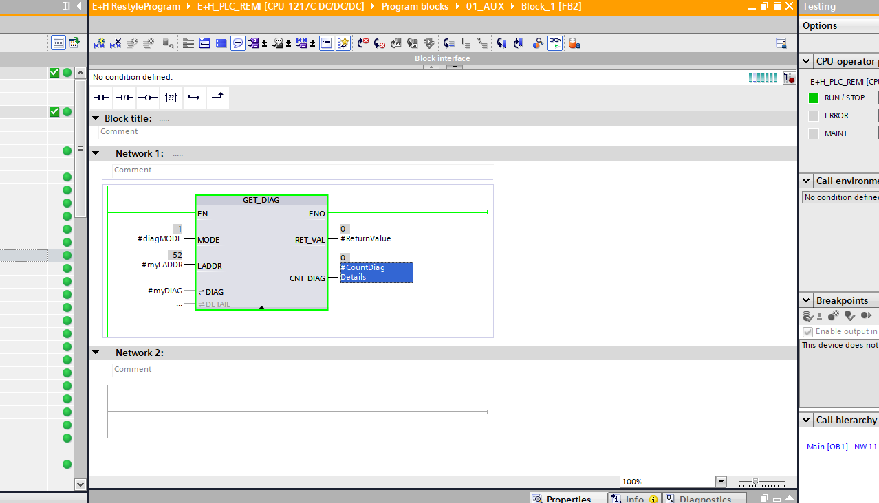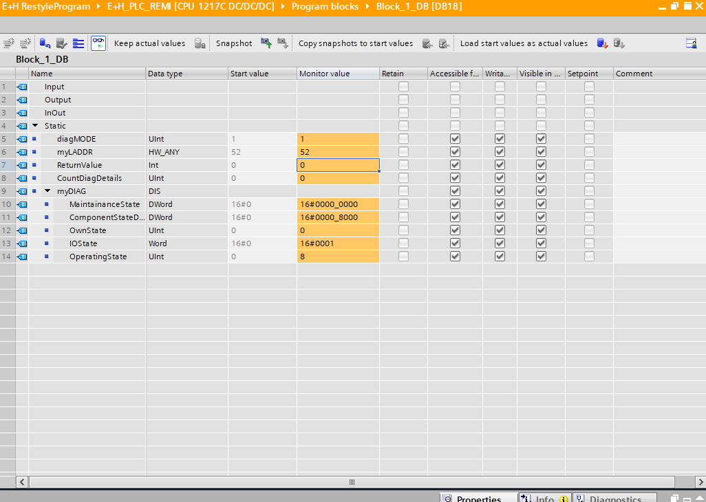 daniele__32 Inserita: 15 ore fa Autore Segnala Inserita: 15 ore fa ho guardato un po in rete e sul SSIO parla della funzione GET_PLC_STATE che però sul V18 del TIA non c è. C è però la funzione GET_DIAG che penso sia la sua sostituta. configurando i parametri suggeriti nella db in lettura nel campo OperatingState della struttura MyDiag, il valore 8 indica cpu in RUN ma se dal simulatore metto la cpu in stop rimane sempre ad 8 e non passa a 4 CPU in stop