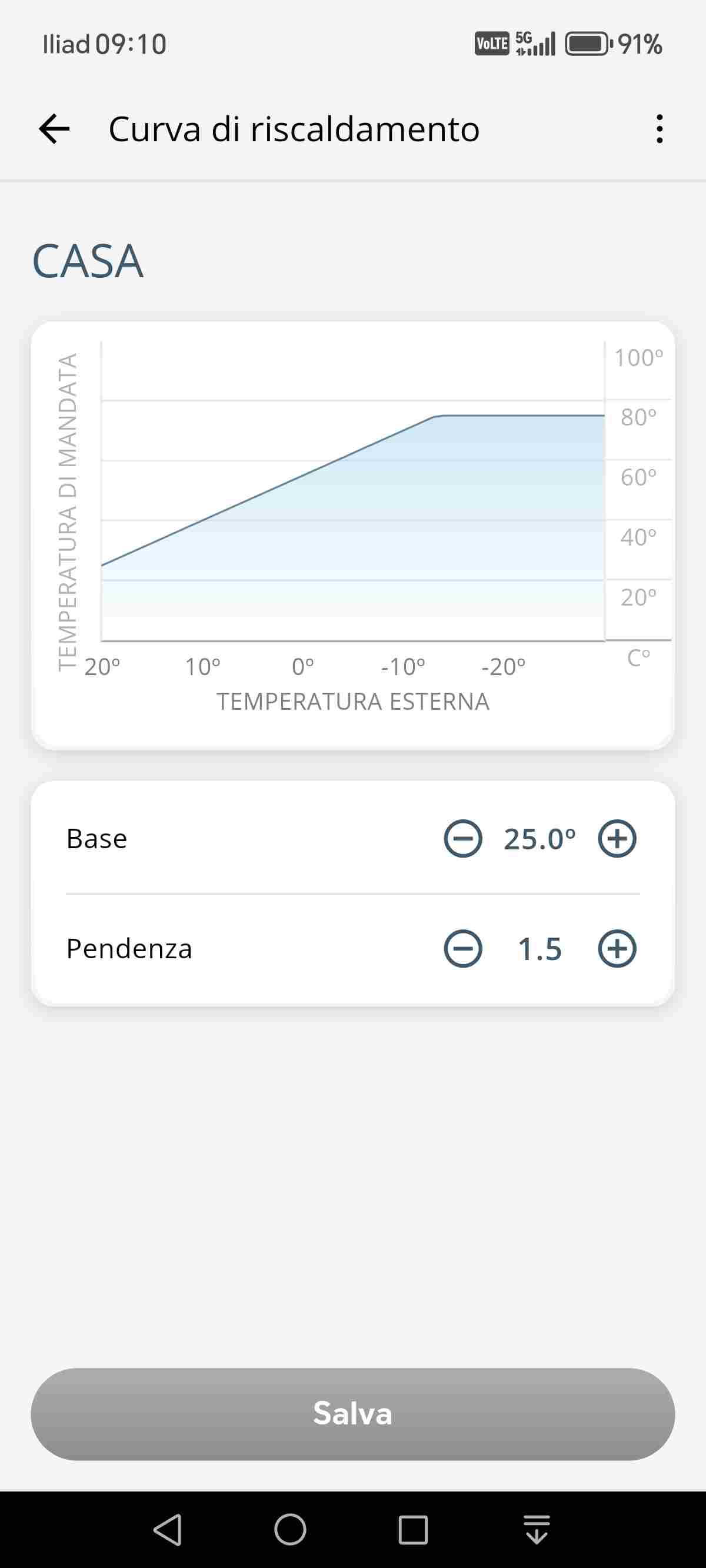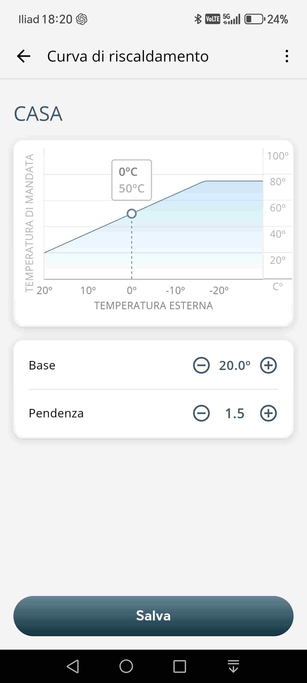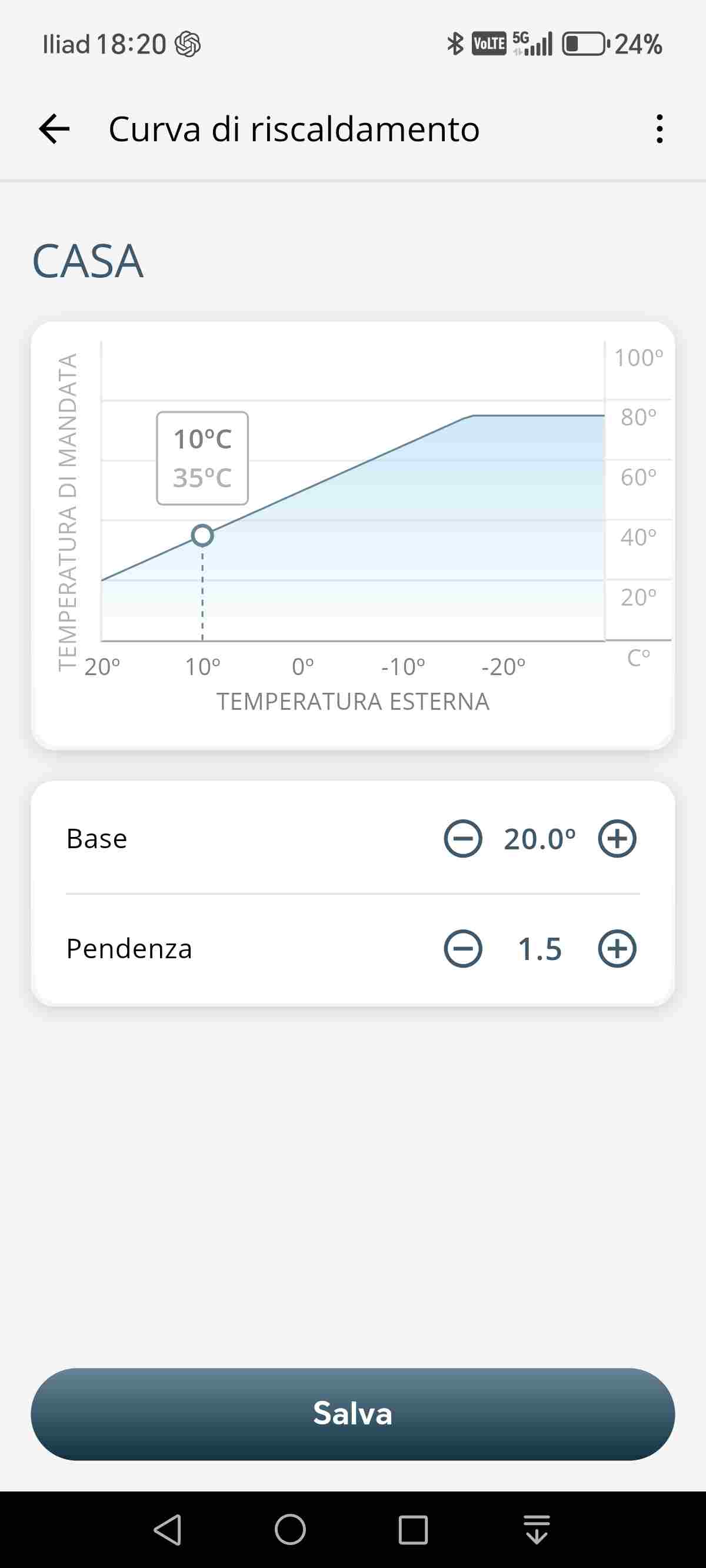anguz91 Inserita: 15 ore fa Autore Segnala Inserita: 15 ore fa 8 minuti fa, reka ha scritto: l'ideale è far lavorare la caldaia sotto i 60 gradi (con ritorno sotto i 55 che permette la condensazione) io non pasticcerei troppo, abbasserei le impostazioni in modo di avere i 70° di mandata solo quando fa molto freddo. se appena arriva il periodo rigido noti che la casa fatica a scaldare alzi le impostazioni in quel campo di temp esterna. è vero che la caldaia rende meglio se accesa h24 con abbassamento di pochi gradi solo la notte, ma rispetto a farlo con una classica accesa comunque 12/14 H/giorno. se prima andava 6 ore e stavi bene in casa allora è meglio così. potresti anche provare a fare una settimana in un modo e una nell'altro verificando i consumi. Chiaramente devi beccare due settimane con le temperature stabili Abbassando la base da 25 a 20,viene così.. Viaggerebbe a 50 gradi con 0 esterna, a 35 con 10 esterna e a 70 con - 13.. Dici di provare così?
