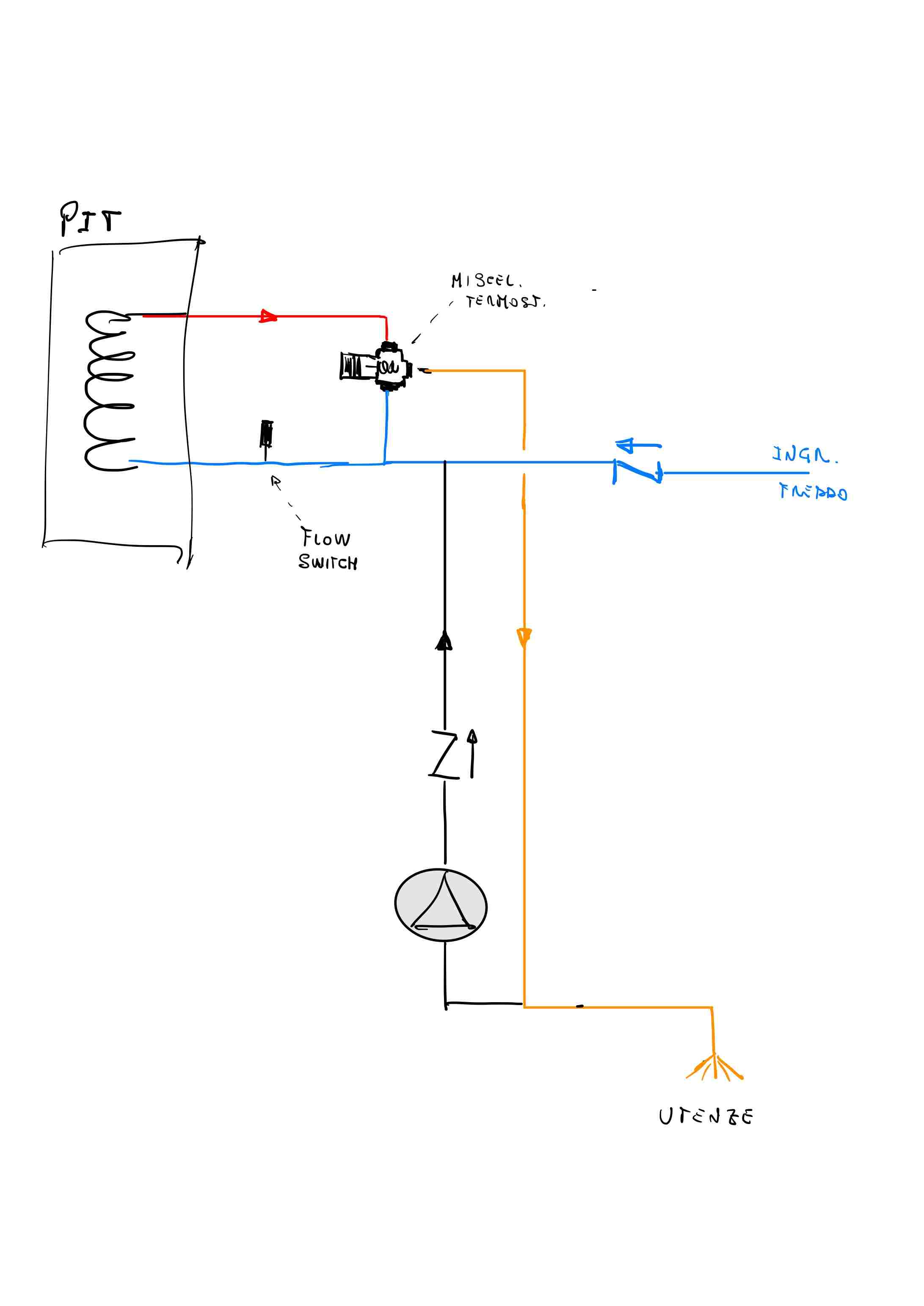 imola Inserita: 5 ottobre Autore Segnala Inserita: 5 ottobre @mrgianfranco Aspetta aspetta , mi fai pensare/ragionare. (Intanto Oggi rifaccio la verifica fisica del circuito se è come disegnato). supponiamo essere corretto: fase iniziale tutto chiuso stacco connettore alimentazione pompa , il contatto flussostato dovrebbe essere aperto per assenza circolazione. Attacco il connettore alla pompa non dovrebbe esserci tensione 230v perché flussostato aperto. Apro rubinetto parte pompa ricircolo chiudo il rubinetto ….forse il ricircolo non si ferma mai perché la pompa terrebbe il flussostato sempre attivo quindi contatto chiuso. una specie di autoritenuta. Potrebbe essere?