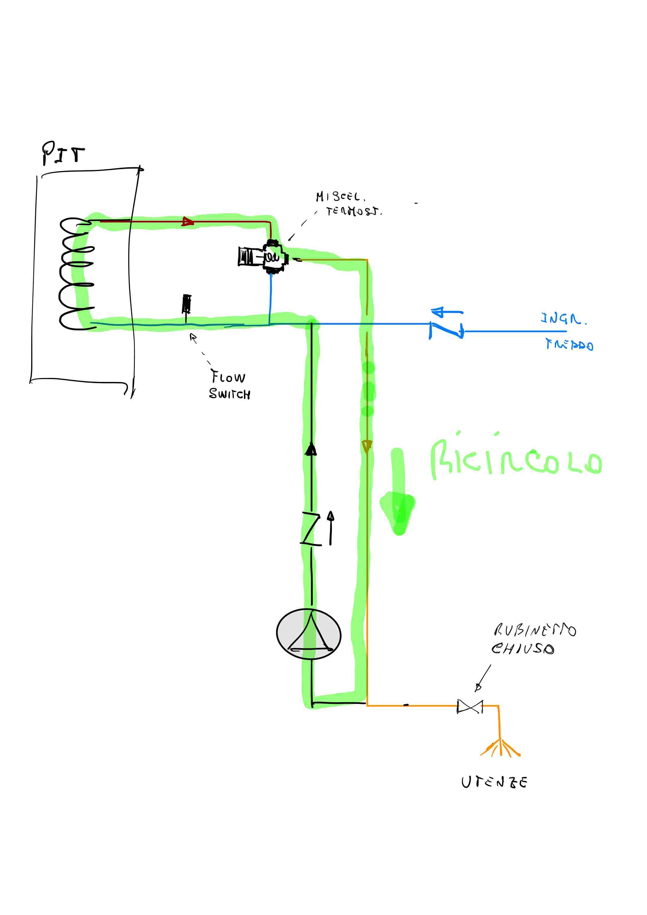 imola Inserito: 4 ottobre Segnala Inserito: 4 ottobre Ciao a tutti a seguito nuovo impianto PDC in sostituzione caldaia a gas, mi hanno posizionato un boiler PIT sul terrazzo e portato l’acqua calda in balcone dov’era la caldaia. Siccome la distanza non è pochissima circa 10 mt è stato fatto un impianto con ricircolo Acs al fine di diminuire i tempi di Acs alle utenze e diminuzione spreco acqua. Sinceramente non riesco a capire bene il funzionamento del ricircolo o meglio non capisco se i tempi di approvvigionamento si riducono davvero se l’attivazione della pompa di ricircolo avviene tramite flussostato all’apertura del rubinetto dell’utenza. se potete spiegarmi Vi ringrazio molto valutando lo schema allegato che ho rilevato.