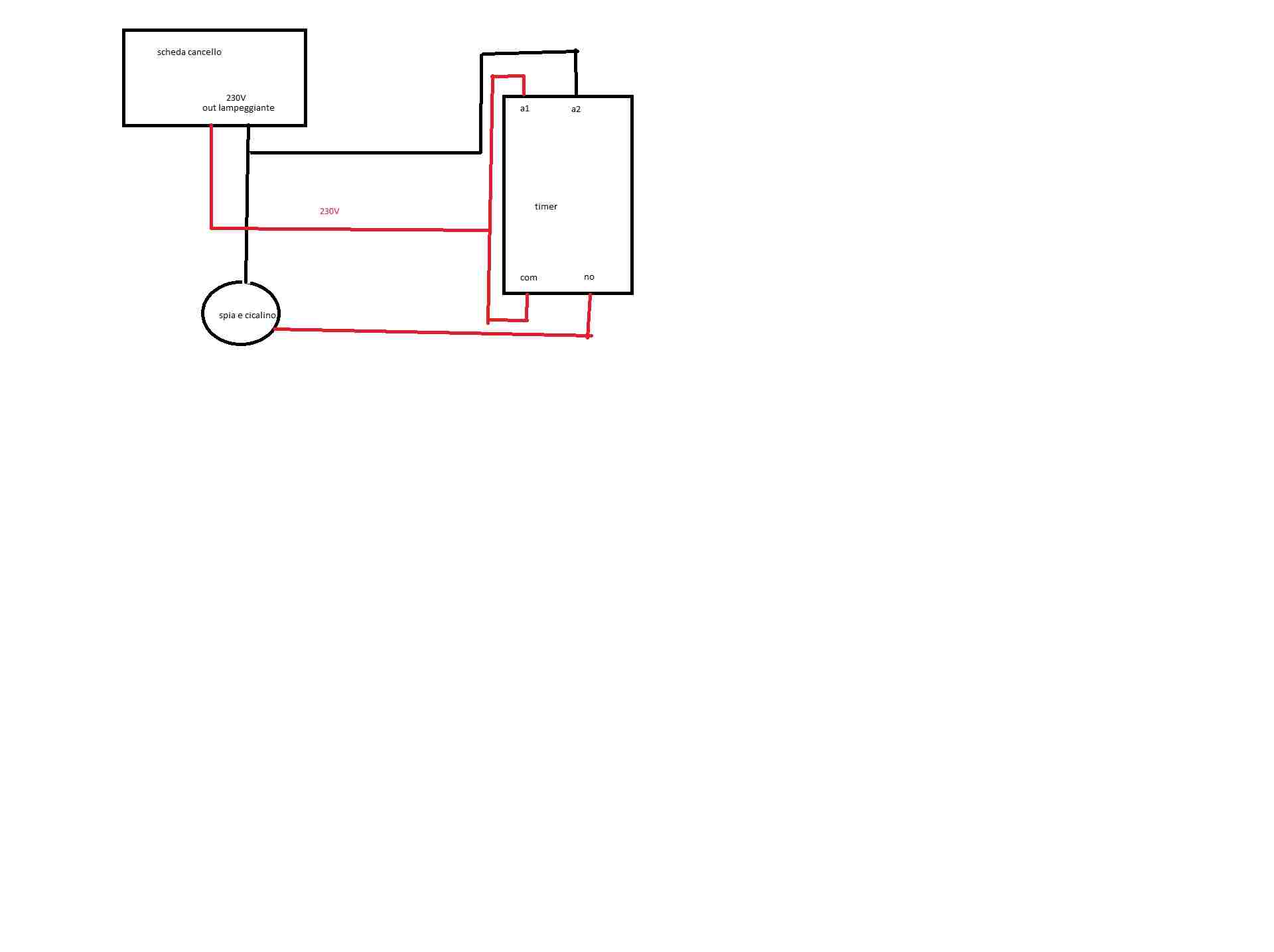 devilx Inserito: lunedì alle 22:41 Segnala Inserito: lunedì alle 22:41 Salve a tutti un cliente mi ha chiesto di installare dentro l'ufficio una lampada spia con cicalino che segnali apertura e chiusura di un cancello. Ho pensato di installare un cicalino con lampada spia insieme al lampeggiante comandato tutto da un timer . il problema e che il anche regolando il timer non stacca il cicalino dura per tutta la durata di apertura e chiusura del cancello. Allego schema che ho usato... Essendo l'uscita del lampeggiante a 230v ho pensato di alimentare tutto tramite questa uscita o sbaglio la??