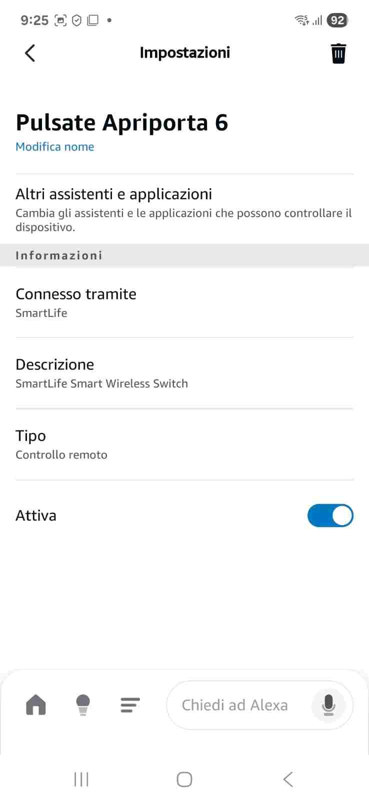 Eolox Inserita: 9 ottobre 2025 Autore Segnala Inserita: 9 ottobre 2025 i tuoi mi sembra di capire, che sono tutti in uscita previo controllo vocale o tap sull'applicazione, il mio caso invece e un ingresso, a monte ci sta il bottone-switch. Per rispondere alla tua domanda.. Si e la board di alexa sull'app, come vedi, viene riconosciuto il pulsante, passato dalla SmartLife o tuya... Il tipo "controllo remoto e giusto"? Smanettando sono arrivato a tappare su "altri assistenti applicazioni" dite che e la strada giusta?