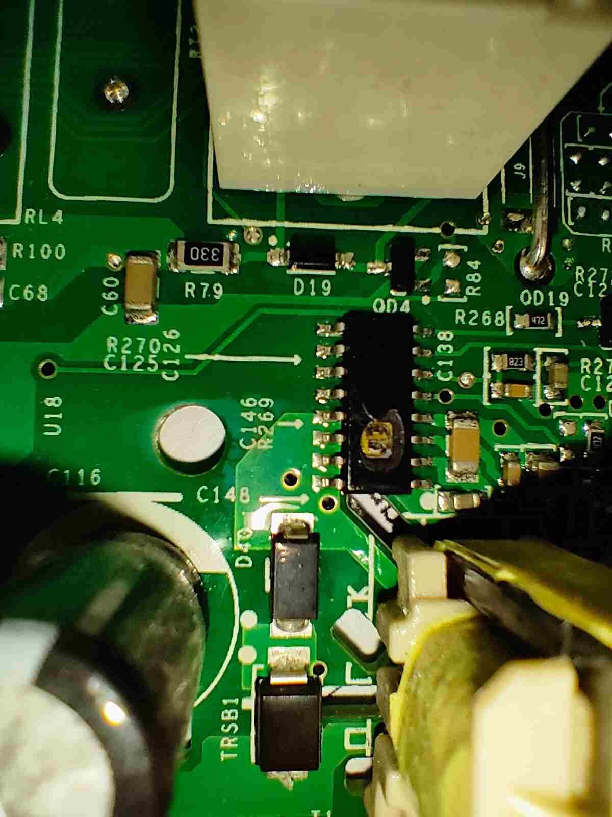 giggid Inserito: 13 ottobre Segnala Inserito: 13 ottobre Salve su questa scheda avrei bisogno di sapere il cicuito integrato a 16 pin (fisicamente danneggiato) contrassegnato come U18 è posto nei pressi di 5 elettrolitici un relè ed un piccolo trasformatorino. Vorrei provare a sostituirlo ma è danneggiato e non se ne legge la tipologia. Allego una foto della parte e della scheda. Grazie