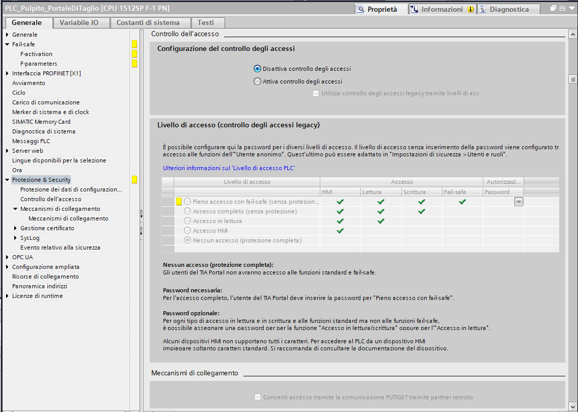 Davide.Paio Inserito: 5 ore fa Segnala Inserito: 5 ore fa (modificato) Buongiorno a tutti, premetto che è la prima volta che utilizzo una CPU serie 1500, per la precisione: CPU 1512SP F-1 PN (6ES7 512-1SM03-0AB0). Sto usando TIA V19 Ho inserito la CPU nel progetto, inserito la Password per la protezione dei dati di configurazione PLC riservati, Disattivato il Controllo degli Accessi ora arriva il mio problema...: come diavolo metto il Livello Di Accesso a ACCESSO HMI oppure ACCESSO COMPLETO? Ho visto che per abilitare il GET/PUT va fatto da Utenti e Ruoli ma è fin troppo. Tramite GET/PUT ci devo collegare un HMI di Weintek quindi spero che vada. Ho letto in giro qualcosa a riguardo di farlo con il Server Web (che sulla mia CPU ho disabilitato) ma non ho trovato nient'altro a riguardo. Qualcuno è così gentile da delucidarci come procedere? Grazie Davide Modificato: 5 ore fa da Davide.Paio