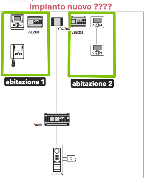 Alby1212 Inserito: 5 novembre Segnala Inserito: 5 novembre Buonasera a tutti, faccio una piccola premessa, devo sostituire un impianto citofonico completo e integrare il nuovo impianto in uno già esistente. IMPIANTO ATTUALE le unita abitative sono 2 e sono distinte in tutto. sono installati 2 impianti citofonici/videocitofonici differenti: - abitazione 1 ---> citofono bticino (5 fili) composto da : - 1 posto esterno - 2 cornette - 1 alimentatore - tramite i pulsanti ausiliari della cornetta apro il cancello pedonale, apro il cancello per auto, blocco il cancello per auto e chiudo il cancello per auto (ogni funzione un pulsante differente) - abitazione 2 ---> videocitofono bpt (2 fili) composto da : - 1 posto esterno (THANGRAM) - 1 cornetta video (AGATA VIDEO) - 1 alimentatore (VA/01 - 62700030) - il cancello pedonale viene aperto dal videocitofono - il cancello auto non è controllato dal videocitofono lascio in allegato le foto dei componenti... IMPIANTO NUOVO io vorrei sostituire interamente l'impianto bticino 5 fili, e creare un impianto condiviso per le due abitazioni da unificare i componenti. - pulsantiera esterna unica, inserire un secondo tasto nella pulsantiera thangram. - abitazione 2 ---> mantenere la stessa configurazione - abitazione 1 ---> installare 2 videocitofoni (plx video o futura ) e comandare i due cancelli (pedonale e auto) da videocitofono. leggendo nei vari manuali ho trovato un ipotetica configurazione hardware dell'impianto... e ho visto che servono componenti aggiuntivi come vse/301 e xdv/304 per poter realizzare l'integrazione che componenti servono? i componenti citati sopra sono necessari? servono altri componenti per poter integrare un altra casa? serve un software di configurazione? se si dove posso trovarlo? serve una licenza per utilizzarlo? oppure è fattibile la configurazione senza software? grazie a tutti per l'aiuto Alberto