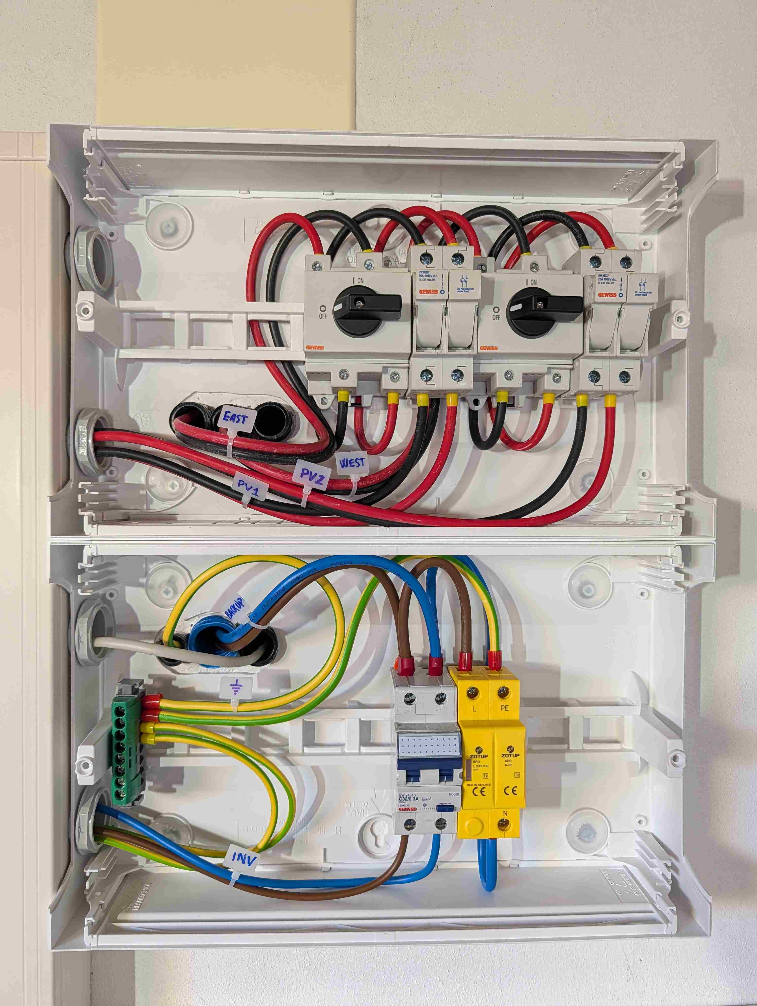 mircolino Inserito: domenica alle 10:31 Segnala Inserito: domenica alle 10:31 Ho da poco installato un impianto fotovoltaico Huawei. Avendo installato ottimizzatori sotto i pannelli, Huawei sconsiglia di installare SPD nel quadro DC perchè potrebbero creare problemi di comunicazione con l'inverter. Incuriosito ho chiamato il supporto Zotup qui a Bergamo il quale mi ha detto che non è vero e corro solo il rischio di friggere tutto l'impianto al prossimo temporale. Mi sono comunque fatto lasciare i due SDP dalla ditta costruttrice, chiedendogli però di non installarli. Questo è l'impianto: Come si vede dalla foto sopra, questo è lo schema attuale: Adesso, se volessi verificare se i due SPD interferiscono o meno con gli ottimizzatori, come andrebbero installati? Posso semplicemente aggiungere l'SPD allo schema attuale? Vedo invece comunemente online schemi di quadri DC dove le stringhe sono collegate all'ingresso dei fusibili e l'inverter all'uscita del sezionatore: Anche 'inverter (letteralmente a 50 cm di distanza) ha un sezionatore DC. Potrei quindi togliere quelli nel quadro e semplificare l'installazione? Nel mio caso quale sarebbe lo schema più corretto? Grazie!