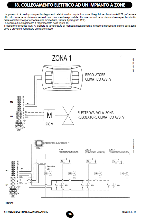 Danone88 Inserito: 10 novembre Segnala Inserito: 10 novembre Buongiorno, mi sono trasferito in una casa con una caldaia Baxi Luna3 Silver Space HT 240 e vorrei utilizzare un termostato smart Netatmo (che già possiedo) per controllare accensione e spegnimento dei termosifoni tramite smartphone. È presente anche il regolatore climatico AVS77 installato in casa a muro, che devo mantenere per la gestione dell’acqua calda sanitaria. Dal manuale tecnico della caldaia risulta che il termostato ambiente deve essere collegato ai pin 1 e 2 della morsettiera M2 (T.A. Zone), come confermato anche dal pinout sulla caldaia stessa. Tuttavia, quei due pin hanno già dei collegamenti presenti: ho misurato la tensione sul pin 1 della morsettiera M2 (che risulta ponticellato con M1-L) e ho rilevato 230 V, mentre il controllo del Netatmo è a contatto pulito (bassa tensione, alimentazione separata). Vorrei capire se, per installare correttamente il Netatmo, devo: rimuovere completamente i collegamenti attualmente presenti sui pin 1 e 2 della morsettiera M2; rimuovere il ponticello che collega M1-L a M2-1, visibile sia nello schema elettrico del manuale che nella foto allegata; altro? Ho il dubbio se il contatto TA su questa caldaia sia effettivamente a 230 V oppure se il ponticello è solo di riferimento logico e vada rimosso per usare un contatto secco come il Netatmo: teoricamente sul sito ufficiale Netatmo la caldaia risulta indicata come compatibile con il termostato.. Vi allego l'estratto del manuale con schema elettrico e collegamento termostato ambiente, e foto della morsettiera/scheda elettronica. Grazie in anticipo per qualsiasi consiglio. Daniele