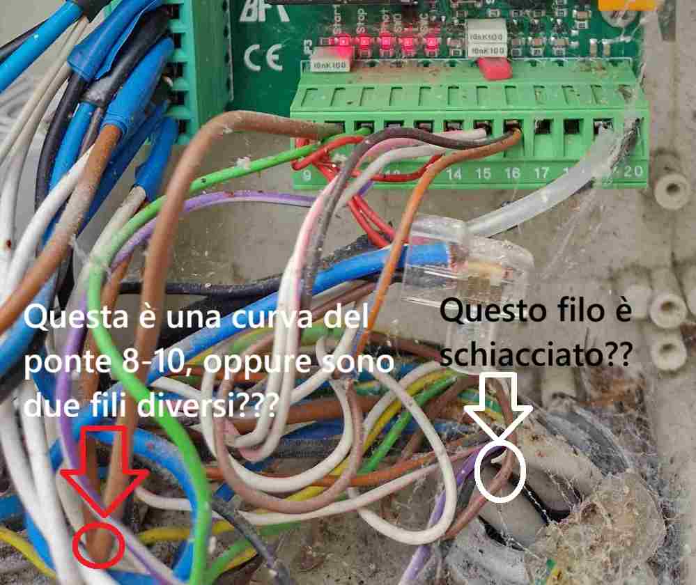 ROBY 73 Inserita: mercoledì alle 21:47 Segnala Inserita: mercoledì alle 21:47 Ciao Simo771, Il 11/11/2025 alle 22:27 , Simo771 ha scritto: ........allego foto led sulla centralina bft mod ancor n e vedo che il comando di start è attivo che secondo me non è corretto. https://www.atecnica.fr/file/ist-bft-alcor-n-manuale-istruzioni-collegamenti-mounting-wiring-manuel-d-instruction.pdf In effetti il led START è acceso "bello fisso e luminoso" e come hai detto tu, questo non dovrebbe essere. Quindi, potrebbe esserci un pulsante e/o il selettore a chiave che ha il contatto ossidato / incastrato o comunque erroneamente chiuso. Fai la prova che ti ha suggerito @Stefano Dalmo e poi segui dove va quel filo marrone che è collegato nel morsetto 10. Filo marrone che dalla foto, mi da l'impressione che vada a fare un ponte con il morsetto 8 della morsettiera verticale della sezione a 230V dei motori, quindi ti chiedo se sia realmente così, oppure è un "effetto fotografico" e se il filo marrone cerchiato in bianco è schiacciato o meno: