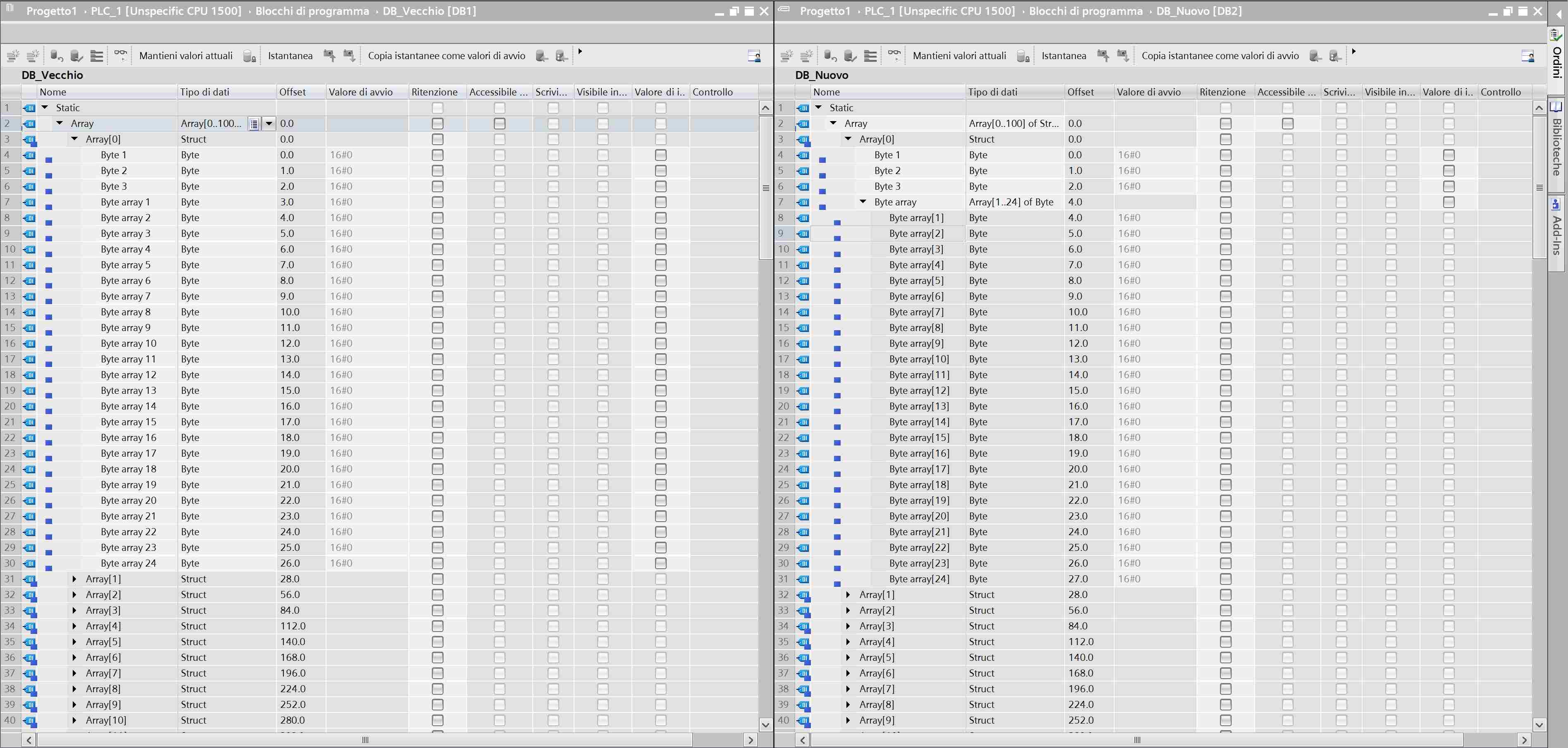 Hat Inserito: 12 novembre Segnala Inserito: 12 novembre Buongiorno a tutti, ho avuto la brillante idea di mettermi ad ottimizzare del codice che "ha sempre funzionato" e sono incappato in un problema che voglio capire se aggirabile o meno. Praticamente ho avuto la necessità di indicizzare dei byte creando un array. Byte che sono all'interno di Db non ottimizzati in quanto vengono letti da uno scada, quindi ho bisogno che gli indirizzi non cambino. Così facendo, come potete vedere dall'immagine, mi sono accorto che sebbene la struttura come numero di byte sia la medesima mi vengono cambiati gli indirizzi dei byte dopo l'indicizzazione. Da quel che posso aver intuito al tia non piace che un array inizi con un indirizzo dispari. C'è un modo per risolvere questo "problema"? Spero di essere stato abbastanza chiaro e grazie a chi risponderà.