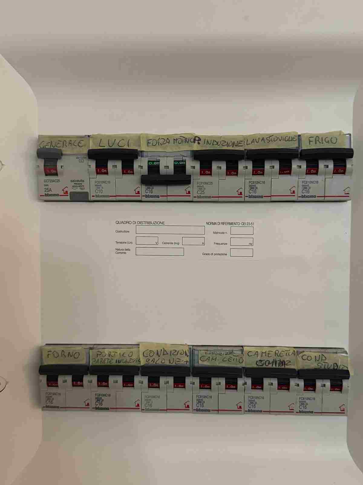 Raimondo64 Inserito: 15 ore fa Segnala Inserito: 15 ore fa Ciao a tutti, ho realizzato il mese di maggio, un impianto elettrico con la supervisione di un tecnico installatore del fotovoltaico, che al momento è al lavoro fuori regione e non può intervenire...i collegamenti finali sul quadro li ha fatti lui ,la potenza della linea è di 4,5 kw. nell'appartamento di mio figlio in ristrutturazione, quindi parte dei cavidotti nuovi e parte gia esistenti. come si evince dalla foto ogni condizionatore viaggia separato,1 da 18000 btu e 3 da 9000 4 mmq cosi come , (induzione 6 mmq,, lavastoviglie,frigo,forno elettrico, tutti vicino al quadro circa 5 metri di linea 4 mmq)luci interne,prese verso la parete esterna(portico),prese interne generali. la linea in entrata dal contatore è di 6 mm, la messa a terra, se non ricordo male la sezione dell'unipolare da 12mm, la linea è tutta da 4 mmq fino alle derivazioni delle stanze per le prese,sezione 2,5 mm per le lampade. i collegamenti che partono dagli elettrodomestici separati sono tutti di un pezzo(senza giunzione), fili nuovi e ben lubrificati, la targhetta forza motrice indica le prese e vi sono collegati gli altri elettrodomestici ed attrezzature varie,3 monitor tv per pc, due pc da lavoro, 1 stampante, 1 asciuga capelli, 1 modem, 1 asciugatrice, 1 lavatrice, 1 tv e 1 forno a micro onde, 2 tv grandi. durante i primi mesi nessun problema,mio figlio mi ha detto che salta il generale e riarmando gli interruttori uno ad uno , il difetto lo fà quello delle prese(F.M.)che comunque non risulta caldo al tatto, gli ho detto di staccare tutto e provare a vedere come va, ma dopo 5/6 ore senza niente collegato salta il differenziale... Vado (70+70 km🫢 ) inizio controllando dal quadro generale il serraggio delle viti e non trovo nessuna anomalia, fili perfettamente inseriti, e quindi comincio dalla derivazione piu lontana, verificando i collegamenti , serraggio fili e cappellotti , verifico le prese stanza per stanza per tutta casa, l'unica anomalia era un neutro poco aderente nell'ultima derivazione, ma il cappellotto non presentava nessuna sfiammata o altro e comunque il problema non è risolto perche dopo un paio d'ore mio figlio mi ha detto che era saltato di nuovo. essendo andato in fissa con le prese non ho provato ad armare i magnetotermici al contrario e cioè partendo dalle lampade in poi. risultato? quando arriva al primo condizionatore salta il generale. oggi hanno sostituito il magnetotermico con uno dello stesso tipo anche se piu vecchio, ma stessa cosa, quindi cosa faccio? preparo un'altra dorsale sezionando le prese del bagno dove c'è asciugatrice e lavatrice e monto 2 magnetotermici da 16, oppure utilizzo 1 differenziale da 32 o addirittura potrei fare 2 linee separate,creando un secondo mini quadro alle spalle del principale,dove non si vede, con un differenziale dedicato ai condizionatori ed il resto lo lascio cosi. tutti gli eventuali consigli sono ben accetti. rappresento che ho già realizzato un altro impianto, in scala minore....questo èra veramente grande..