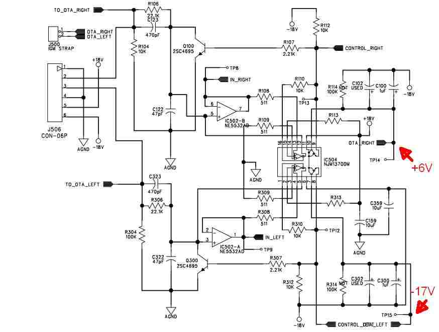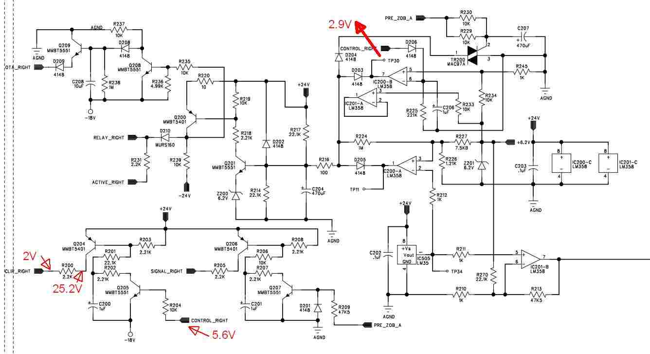 Ctec Inserita: 3 ore fa Segnala Inserita: 3 ore fa Mi pare che CONTROL_RIGHT sia generato dalla parte darlington dell'IC504, e ad occhio sei in protezione, dato che lui è a +5V6 e quindi attiva Q100 che manda a massa il segnale in IN_RIGHT. La causa dovrebbe essere in OTA_RIGHT, che essendo a +6V manda in conduzione il darlington e quindi rende positivo il CONTROL_RIGHT. Infatti nell'altro canale hai OTA_LEFT a -17V... OTA_RIGHT è mandato alto dal circuito intorno a IC101 (CLIP DETECTOR). Tramite questo integrato (e accessori) viene controllato lo stato delle resistenze di emettitore R187 e R186. Se i finali sono buoni, la caduta su queste resistenze deve essere molto piccola. Oppure sono guasti Q109 e Q110 che fanno da soglia, o anche IC101 e componenti limitrofi. Dai un'occhiata in queste zone. A me gli amplificatori con uscita di collettore (anziché di emettitore) non sono mai piaciuti molto. Non ne vedevo da un pezzo.