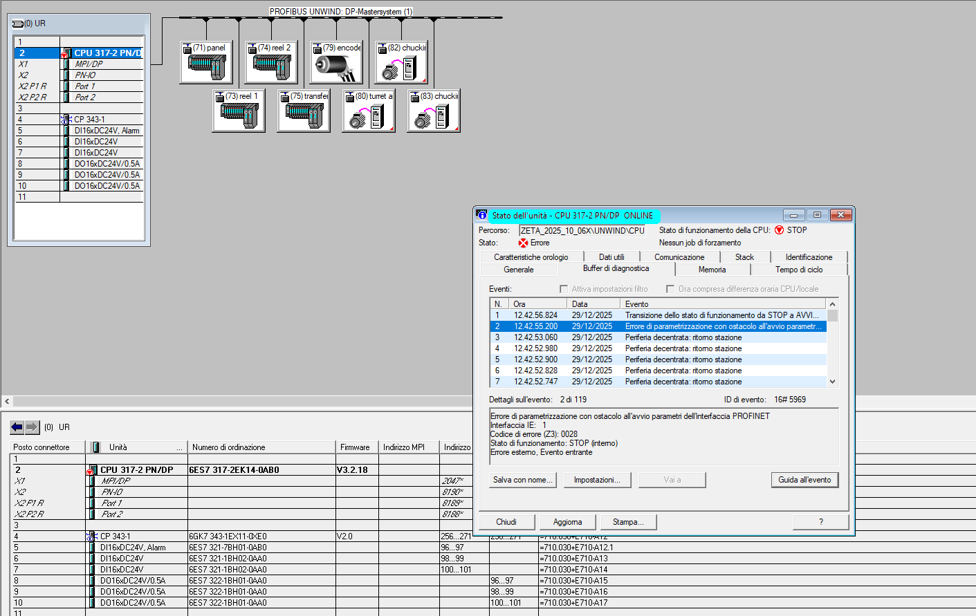 southofsanity Inserito: 2 ore fa Segnala Inserito: 2 ore fa Salve a tutti , ho sostituito una cpu 315 2dp con una 317 2pn dp Mi da un errore di parametrizzazione profinet. la Cpu in questione comunica con un 400 tramite la cp 343 che pero non vedo in allarme. di seguito il descrittivo, non mi era mai capitato. il profinet a bordo CPU attualmente non lo uso e solo una predisposizine futura. Grazie Causa: Durante la valutazione dei dati di progettazione PROFINET CBA o dei parametri delle unità si è verificato un errore e perciò l'avviamento è stato inibito oppure è stato richiesto lo stato operativo STOP. Le informazioni dettagliate contengono informazioni sul tipo di dati di progettazione o di parametri delle unità, il luogo e il tipo di errore. Rimedio: Correggere l'eventuale progettazione errata e caricare nuovamente i dati di progettazione nella CPU. L'indicazione del tipo di SDB 3302 come punto di localizzazione dell'errore, sottolinea in particolare che nel progetto attuale si trovano SDB CBA incoerenti rispetto al resto della progettazione (p. es. confronto della registrazione di data e ora tra SDB CBA, coerenza SDB CBA e progettazione di DP nel tipo di SDB 2000). Ciò si verifica quando, in Configurazione HW, sono state modificate, compilate salvate e caricate nella CPU soltanto alcune parti della progettazione preesistente. In questo caso l'eliminazione dell'errore avviene come indicato nel seguito: Caso 1: si intende mantenere PROFINET CBA. · In Configurazione HW: salvare e compilare le modifiche nel progetto componenti. · In SIMATIC Manager: generare nuovamente il componente CBA. Con i componenti Singelton: · In SIMATIC Manager: caricare il componente nella CPU. · In iMap: importare il nuovo componente · In iMap: sostituire i componenti preesistenti con quello nuovo. Con i componenti standard: 3. In iMap: importare il nuovo componente · In iMap: sostituire i componenti preesistenti con quello nuovo.. 4. In iMap: eseguire la generazione. 5. In iMap: caricare il componente nella CPU.. Fall 2: non si intende mantenerePROFINET CBA. Per rimuovere la progettazione CBA incoerente, procedere come indicato nel seguito: 1. Cancellare i dati di sistema (offline) nel progetto STEP 7 alla voce "Blocchi". 2. Salvare e compilare queste modifiche in Configurazione HW. 3. Caricamento: 1. Caricare il progetto in SIMATIC Manager con il comando di menu Sistema di destinazione > Carica programma utente nella memory card; 2. oppure cancelllare i dati di sistema sulla CPU (online) e caricare il progetto in SIMATIC Manager.